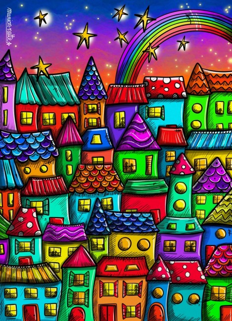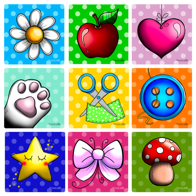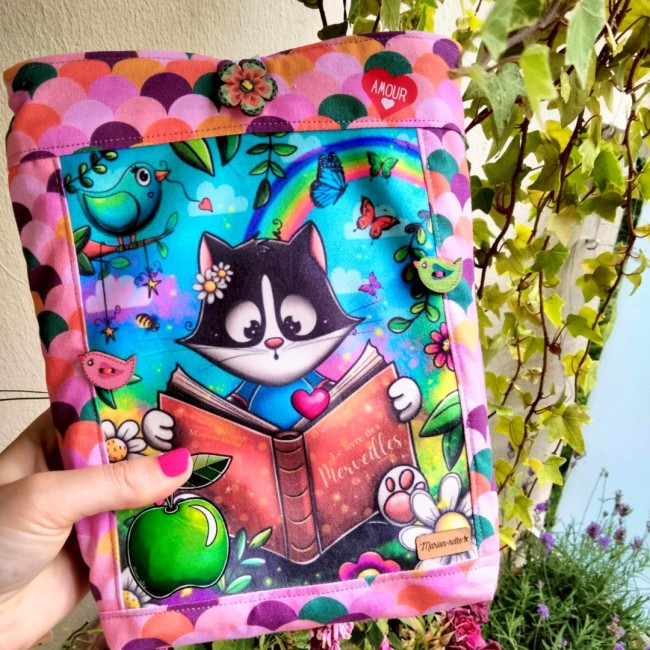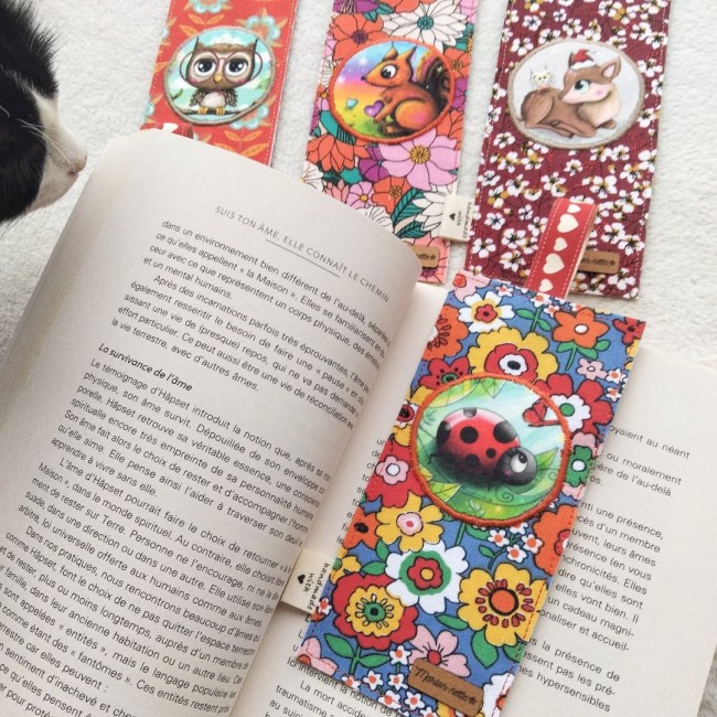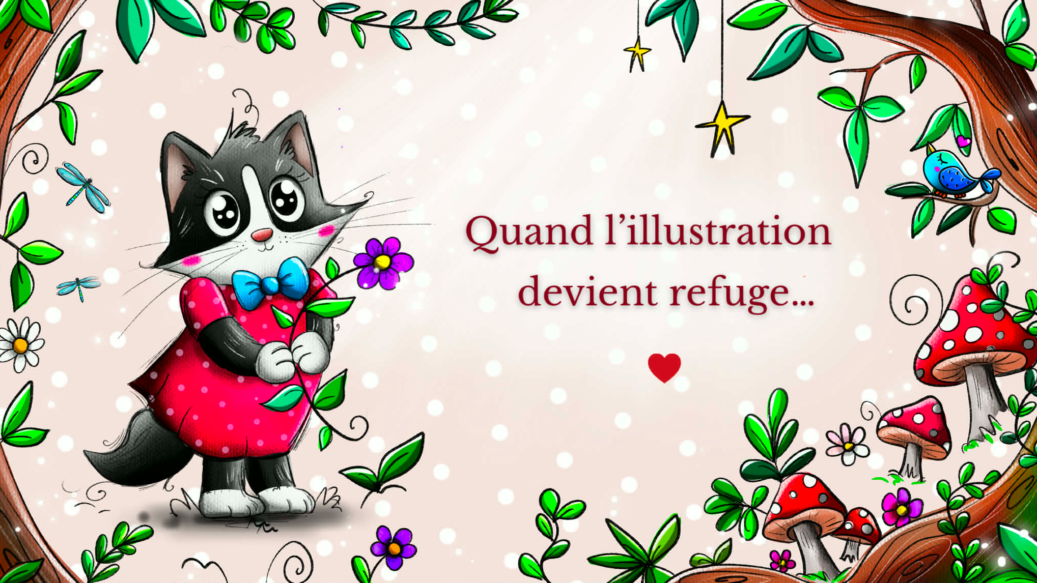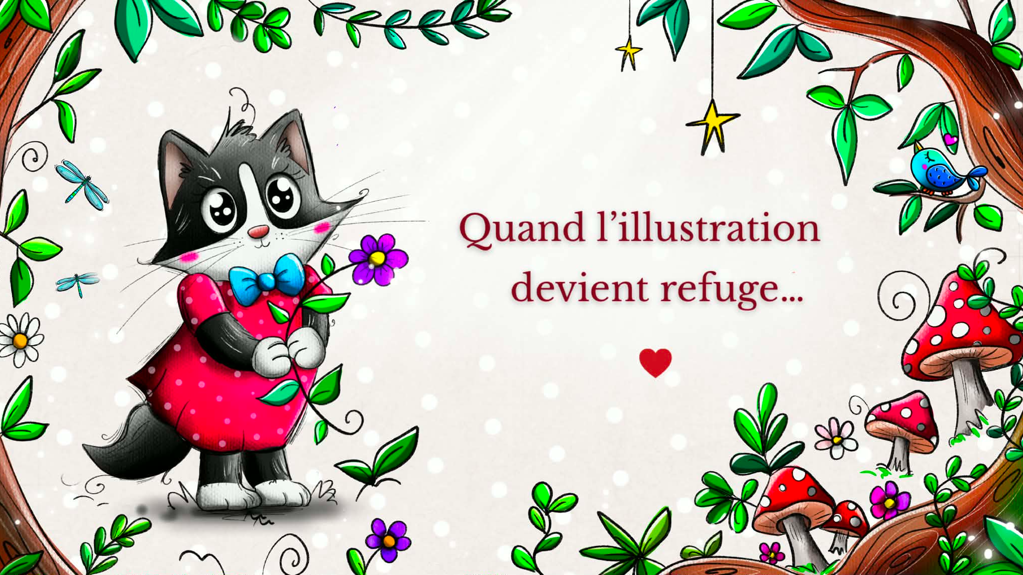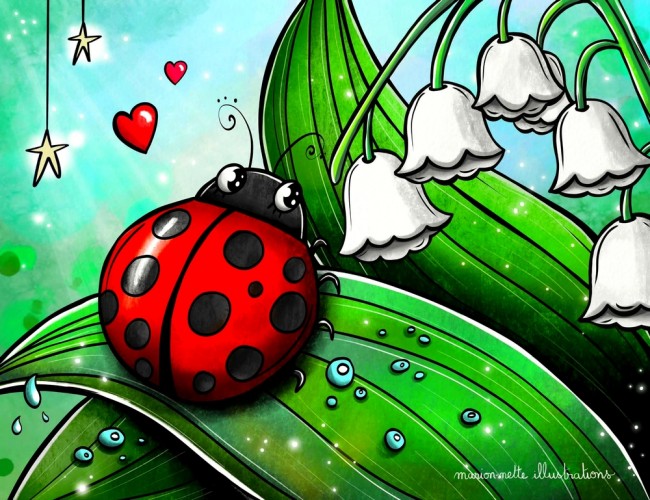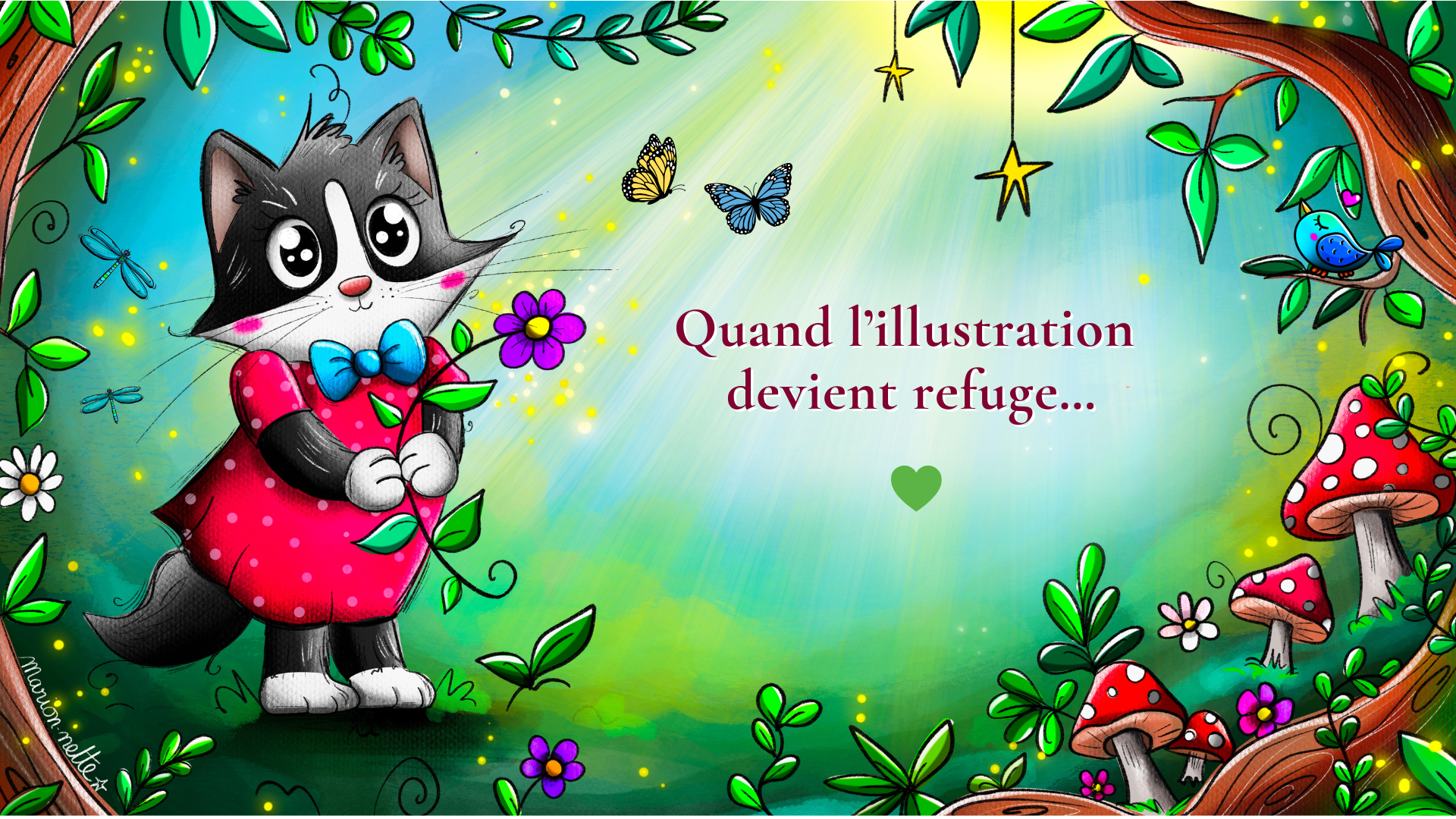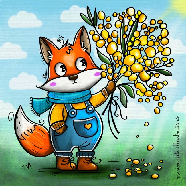 Mon style? Proche de l'art naïf... Il est coloré, vivant, plein de contrastes, volontairement disproportionné, féerique, tantôt drôle, tantôt poétique ! Grande amoureuse des animaux, j'adore les représenter... et notamment Mimie, mon petit chat noir et blanc, qui est devenue l'effigie de mon entreprise, et de ma marque "Marion-nette Illustrations". [...]