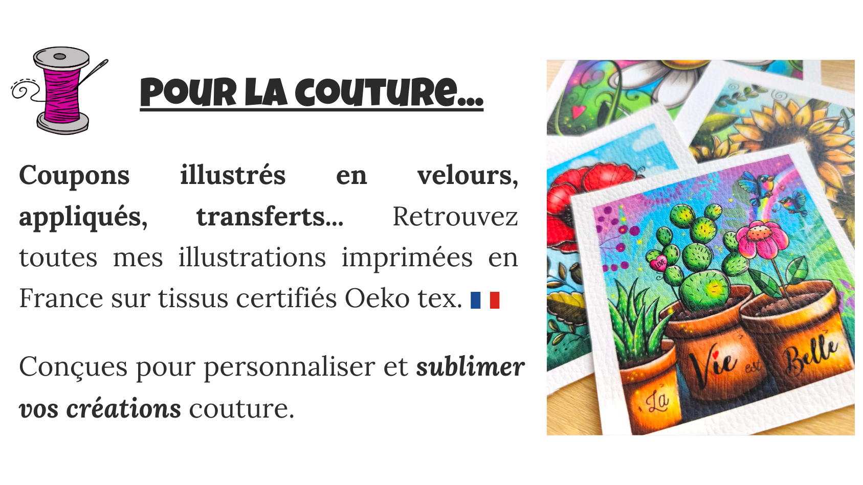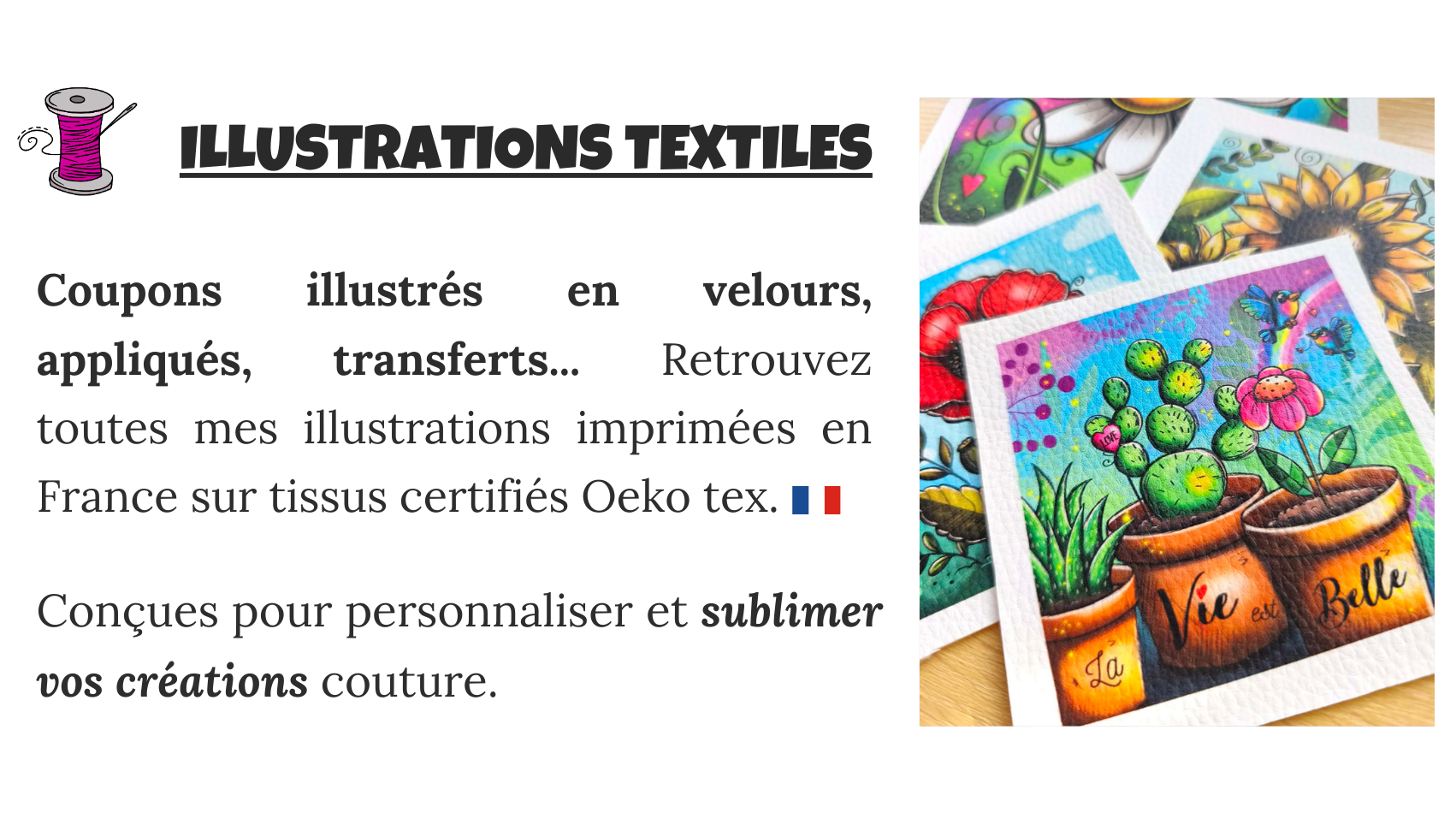 Illustratrice, artiste peintre, poétesse... Je suis multi-casquettes, artiste joyeuse et haute-en-couleurs dans l'âme ! Après des études littéraires, puis l'obtention de mon master Enseignement, je me suis redirigée vers mes passions d'enfance, pour m'y consacrer entièrement. C'est durant mon premier congé parental que j'ai repris le dessin, pour le plus grand bonheur de mes deux enfants. Autodidacte, il m'a fallu tout apprendre et beaucoup dessiner, pour ensuite créer "à ma façon".
