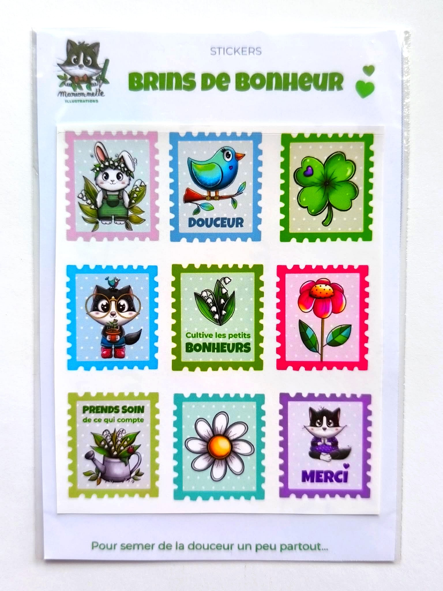 Une planche de 9 timbres illustrés pour semer de la douceur dans ton quotidien.