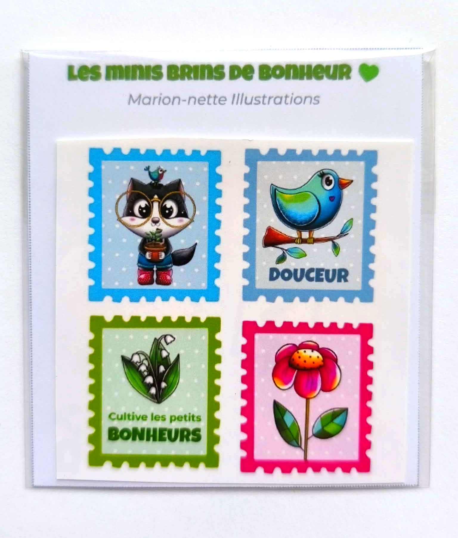 Une planche de 4 timbres illustrés pour semer de la douceur dans ton quotidien.